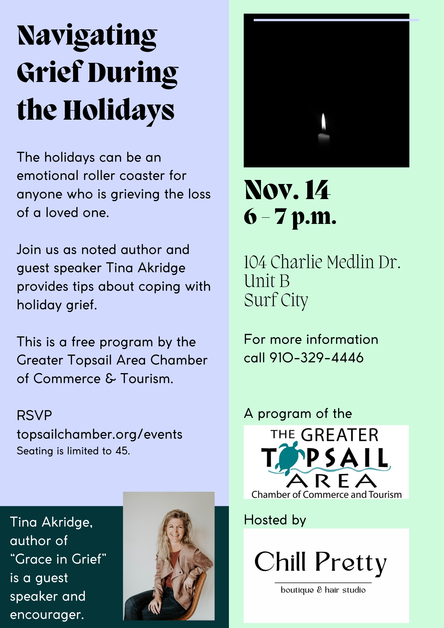 The Greater Topsail Area Chamber of Commerce & Tourism will sponsor a workshop entitled Navigating Grief During the Holidays. The key speaker will be Tina Akridge, a noted author who documented her grief journey. A mental health caregiver will also give tips on navigating grief.