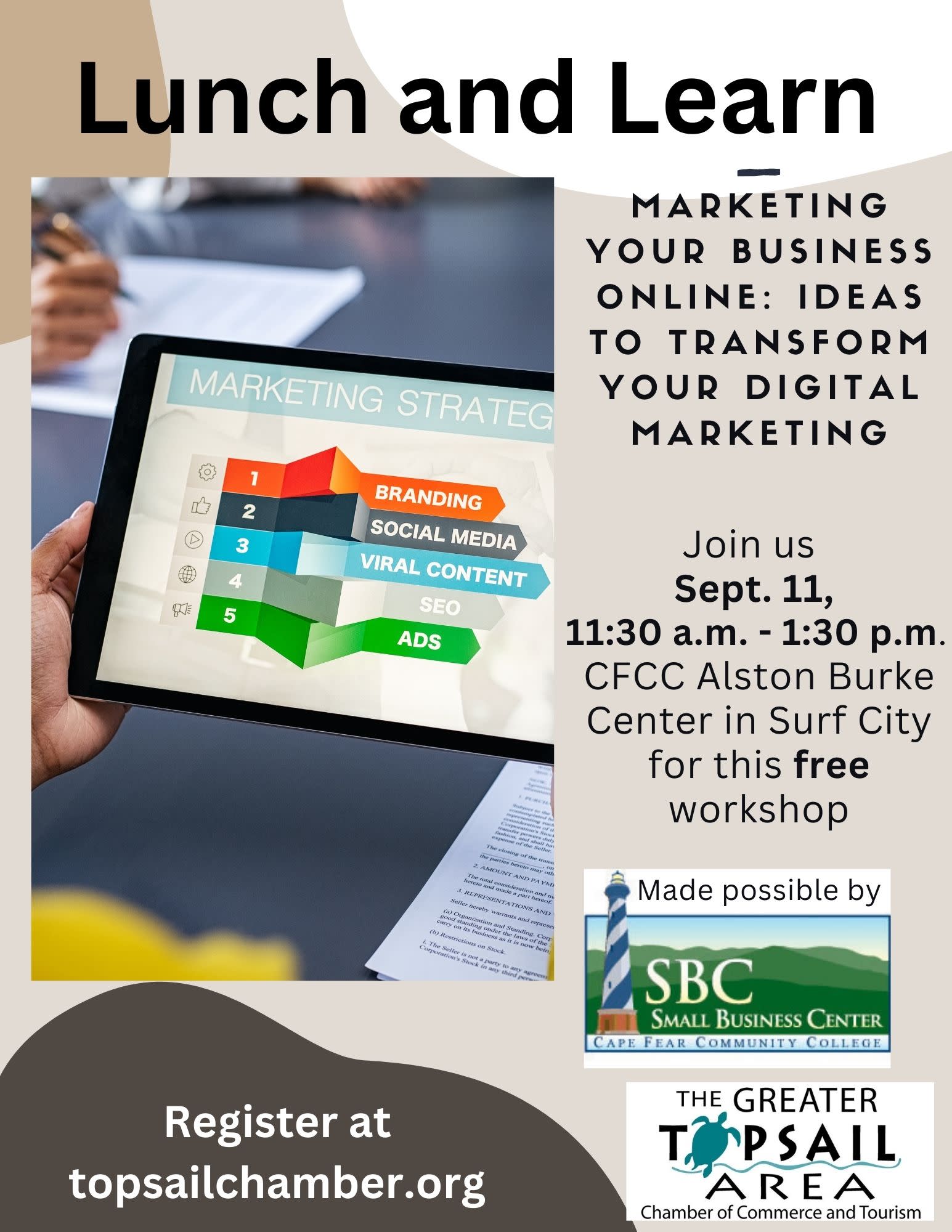 In partnership with the Small Business Center at Cape Fear Community College, the Greater Topsail Area Chamber of Commerce is pleased to invite all business owners to the Sept. 11 Lunch and Learn session, Marketing Your Business Online: Ideas to Transform Your Digital Marketing.